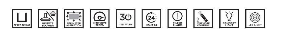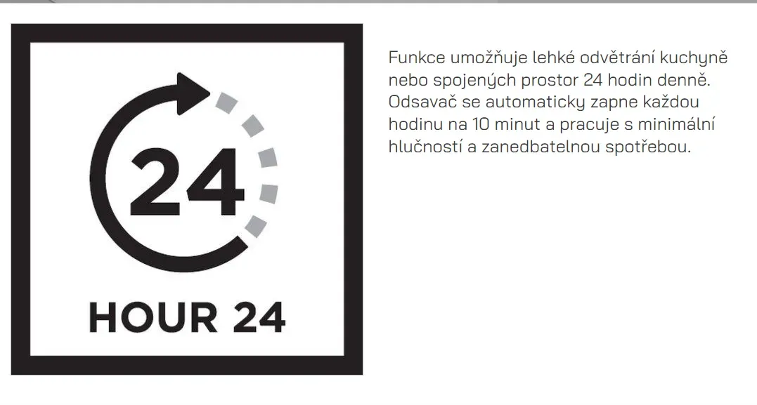 Dotykové ovládání nevystupující z linie čelního panelu vám nabídne nadstandardních množství funkcí. Odsavač se může pyšnit funkcí intenzivního odsávání, signalizací nasycení filtrů, možností doběhu po ukončení vaření a funkcí ventilace "24", která zabezpečí celodenní ventilaci vaší kuchyně.