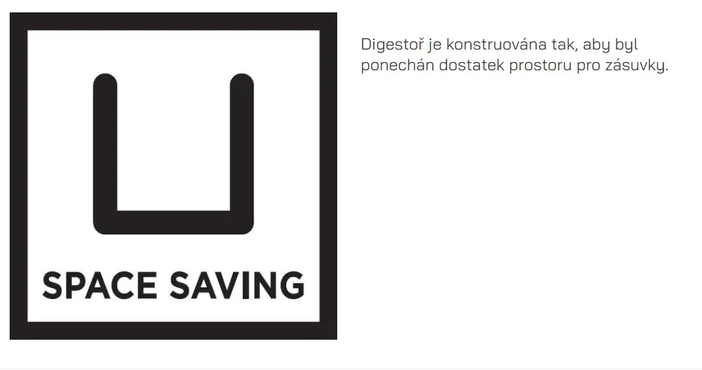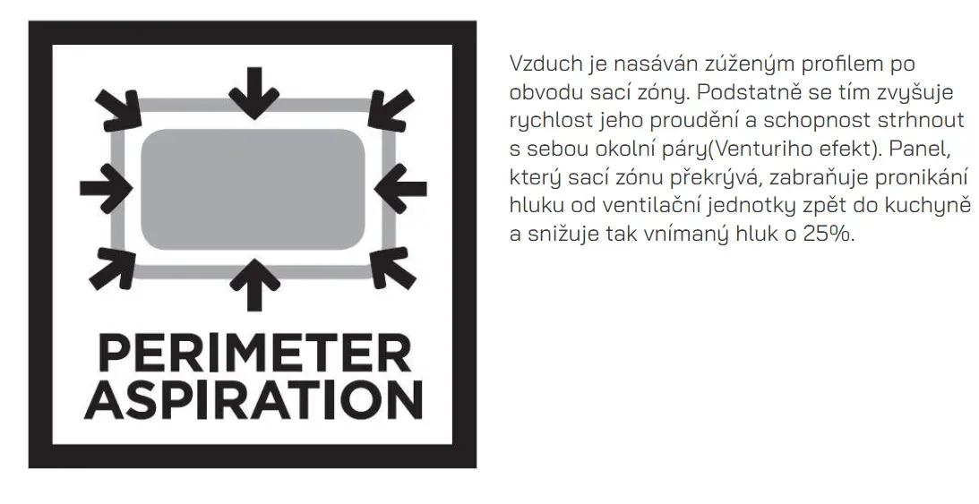 Atraktivitu digestoře zvyšuje štěrbinové sání – vzduch je nasáván zúženým profilem a zrychlené proudění má schopnost strhnout s sebou okolní páry při současném snížení hlučnosti až o 3 dB(A).