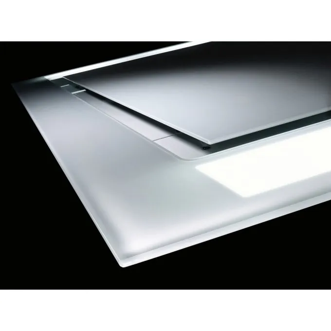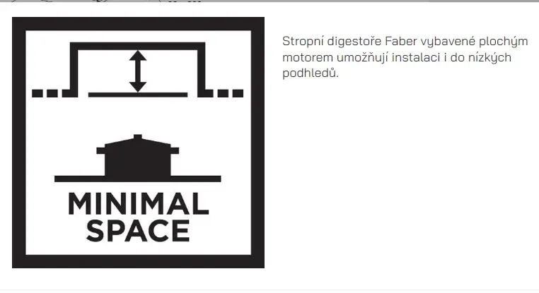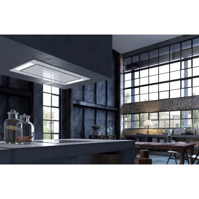 Plné zapuštění digestoře do stropního podhledu zajišťuje maximální volný prostor nad pracovní plochou a kuchyň se díky tomu stává vzdušnější. Zásluhou nízké vestavné části je možné ji instalovat i do velmi nízkých podhledů.