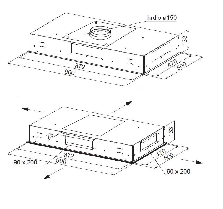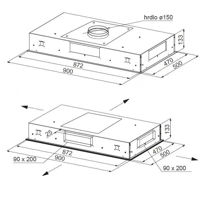 Pro zabudování digestoře stačí pouze 133 mm a potrubí je možné napojit jak z boční části korpusu, tak shora.