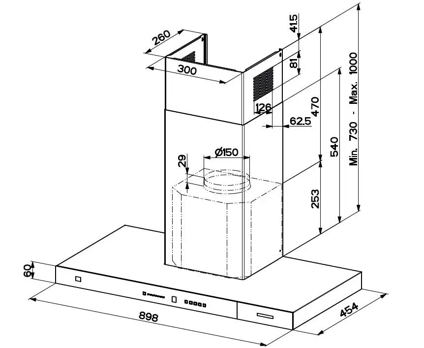Spodní část digestoře je zcela rovná, tradiční kryty světel jsou nahrazeny úzkým LED páskem, který kopíruje vnější tvar panelu a dokonale osvětluje pracovní plochu.