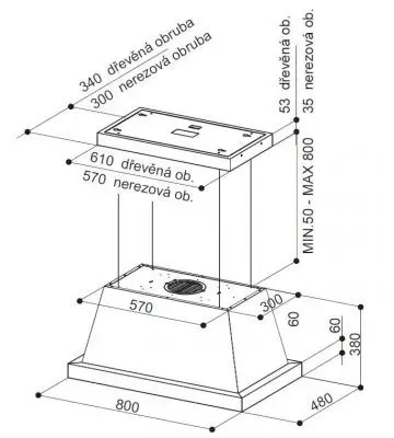 V případě recirkulačního provozu je třeba pro její dokonalý vzhled dokoupit instalační sadu (rám a stropní panel v provedení nerez, buk nemořený nebo mořený dub).