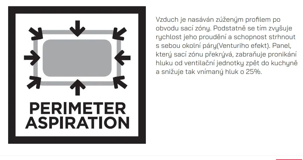 Atraktivitu digestoře zvyšuje štěrbinové sání – vzduch je nasáván zúženým profilem a zrychlené proudění má schopnost strhnout s sebou okolní páry při současném snížení hlučnosti až o 3 dB(A).