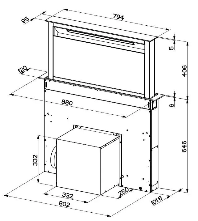 V závislosti na hloubce skříňky, ji můžete umístit před nebo za vestavěnou část digestoře. V případě umístění motoru ze zadní strany budete mít dostatečný prostor pro instalaci vestavné trouby, případně zásuvek. Odtahové potrubí pak můžete připojit z libovolné strany.