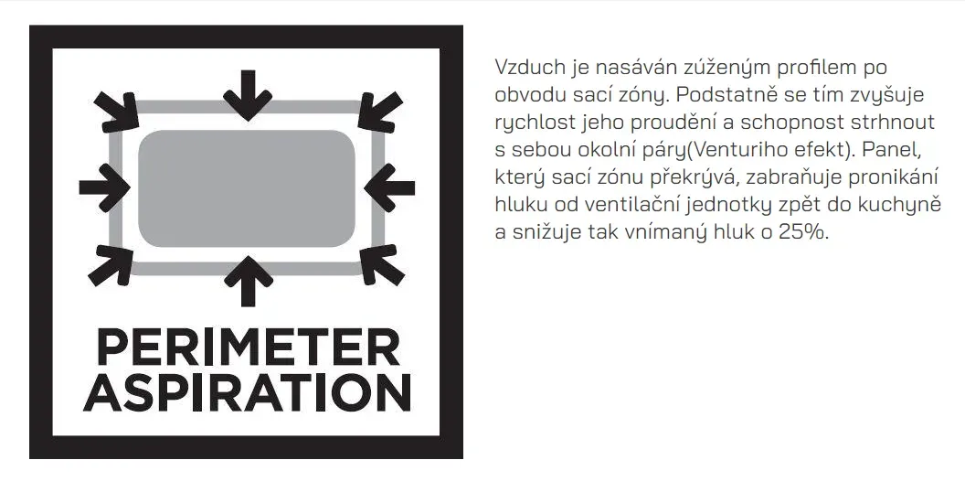 Atraktivitu digestoře zvyšuje štěrbinové sání – vzduch je nasáván zúženým profilem a zrychlené proudění má schopnost strhnout s sebou okolní páry při současném snížení hlučnosti až o 3 dB(A).