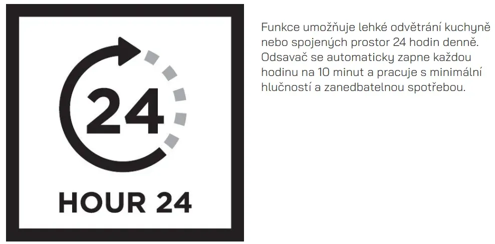 Z nadstandardních funkcí se odsavač může pyšnit možností doběhu po ukončení vaření a funkcí ventilace "24", která zabezpečí celodenní ventilaci vaší kuchyně.