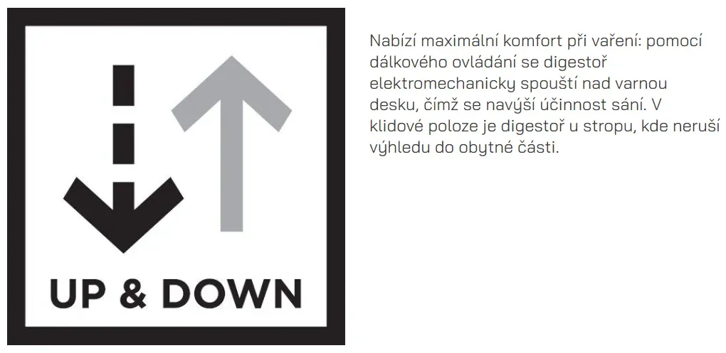 Nabízí maximální komfort při vaření: pomocí dálkového ovládání se digestoř elektromechanicky spouští nad varnou desku, čímž se zvýší účinnost sání.