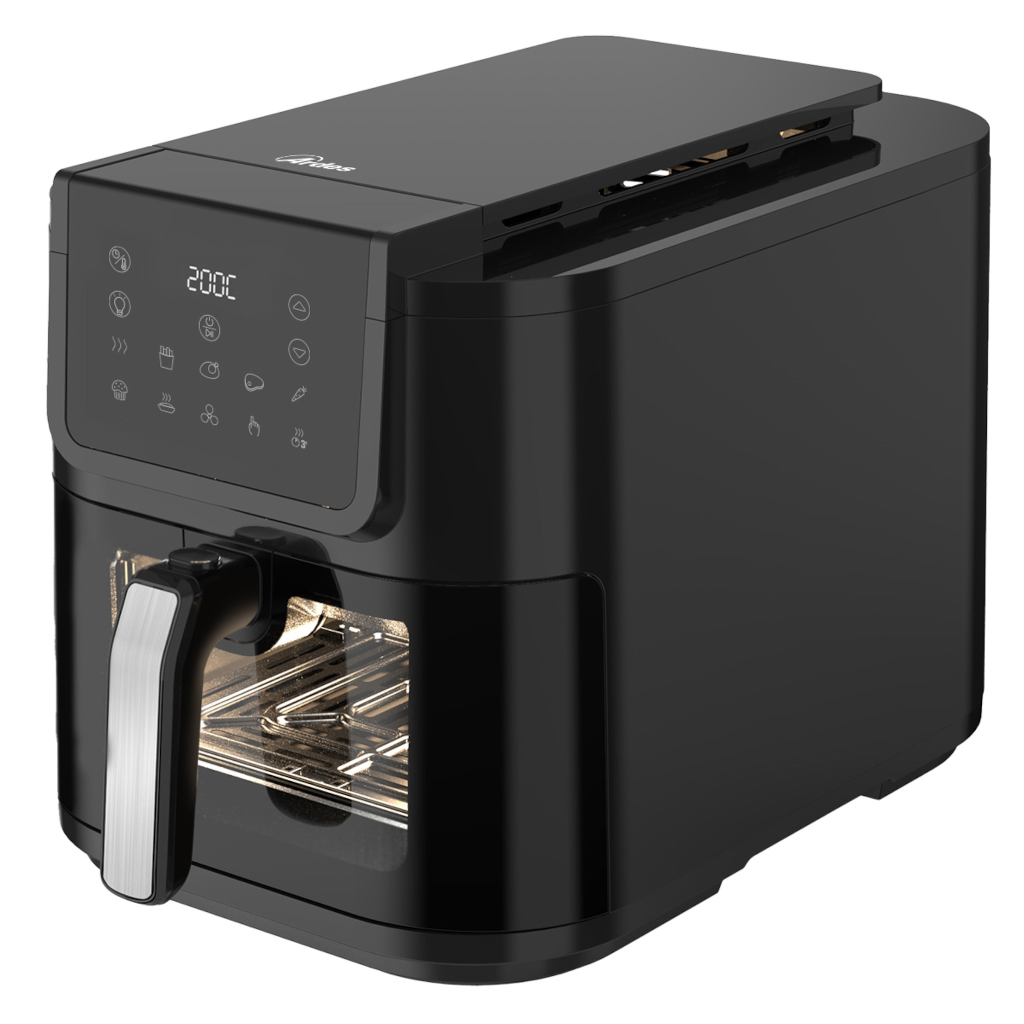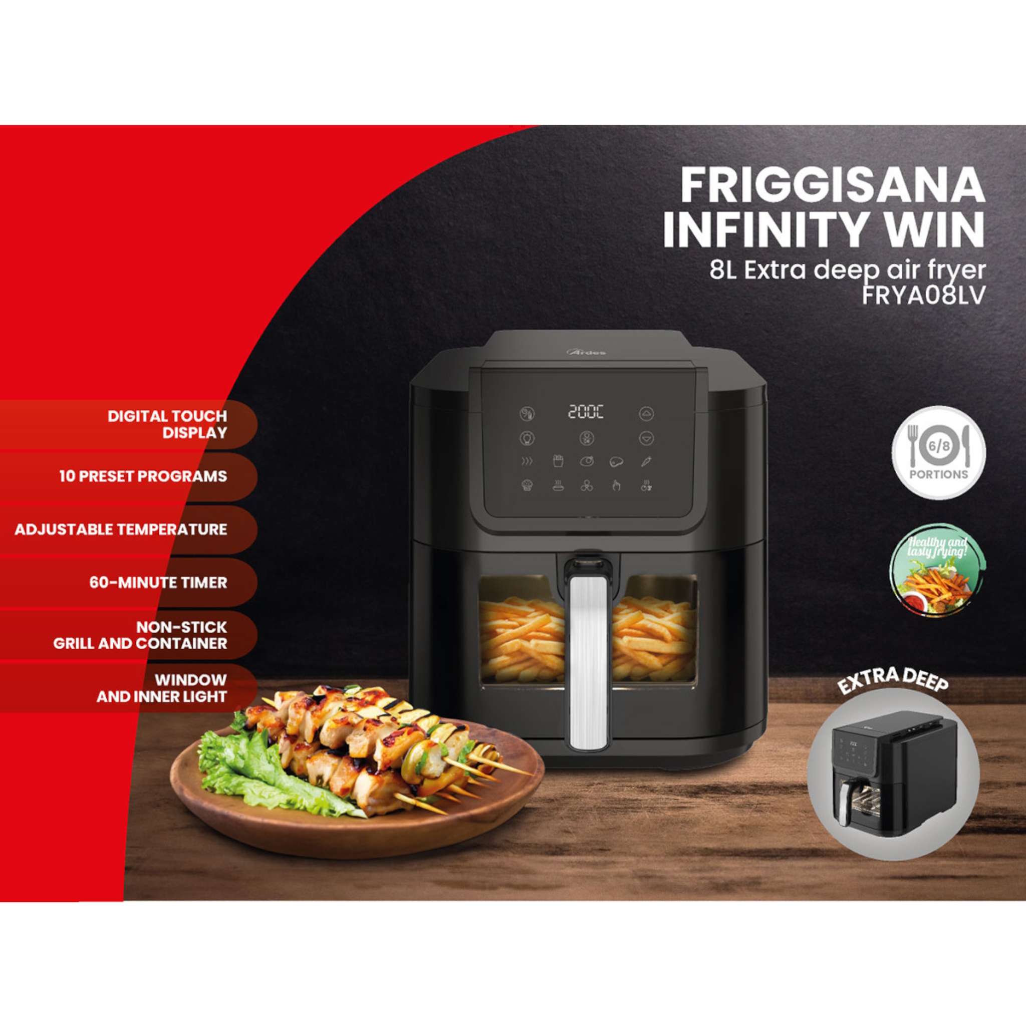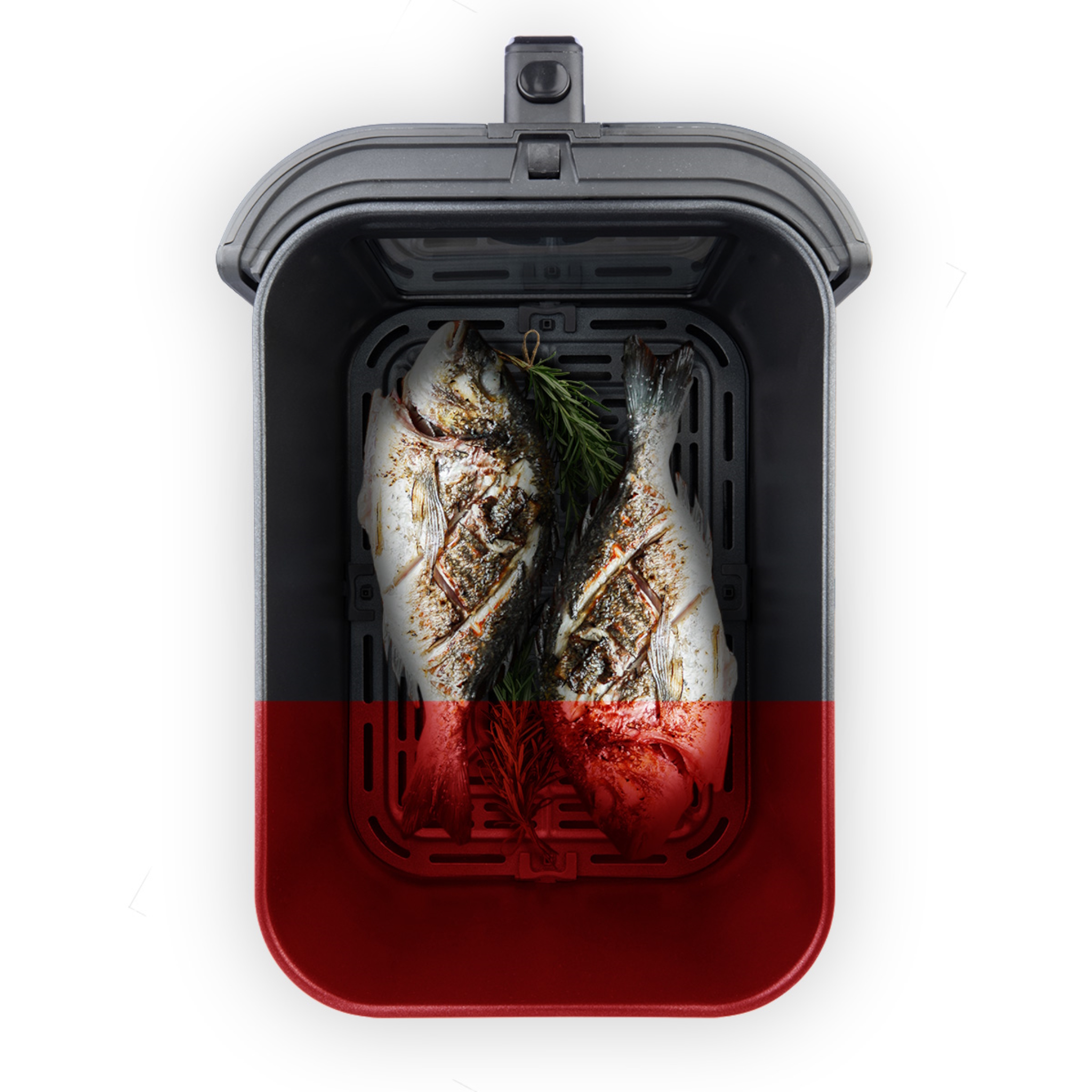 Horkovzdušná fritéza zabírá málo místa a je mimořádně účinná díky exkluzivní hloubce koše, který je speciálně navržen pro přípravu potravin podlouhlého tvaru, jako jsou ryby, kuřata, špízy a mnoho dalšího. Plus 35% místa navíc proti klasické fritéze. Okénko a vnitřní světlo umožňují sledovat přípravu potravin, aniž byste museli koš otevírat. Zdravá alternativa k fritéze a troubě. Dokáže vařit rovnoměrně a rychle, s malým (-80 %) až žádným množstvím oleje. Nižší spotřeba oleje, žádný zápach v kuchyni. Snadné čištění díky omyvatelné nepřilnavé mřížce. Kapacita koše 8l. Rozměry smažící mřížky 21 x 30,5 cm. Nastavitelná teplota 60 - 200 °C. Časovač na 60 minut.