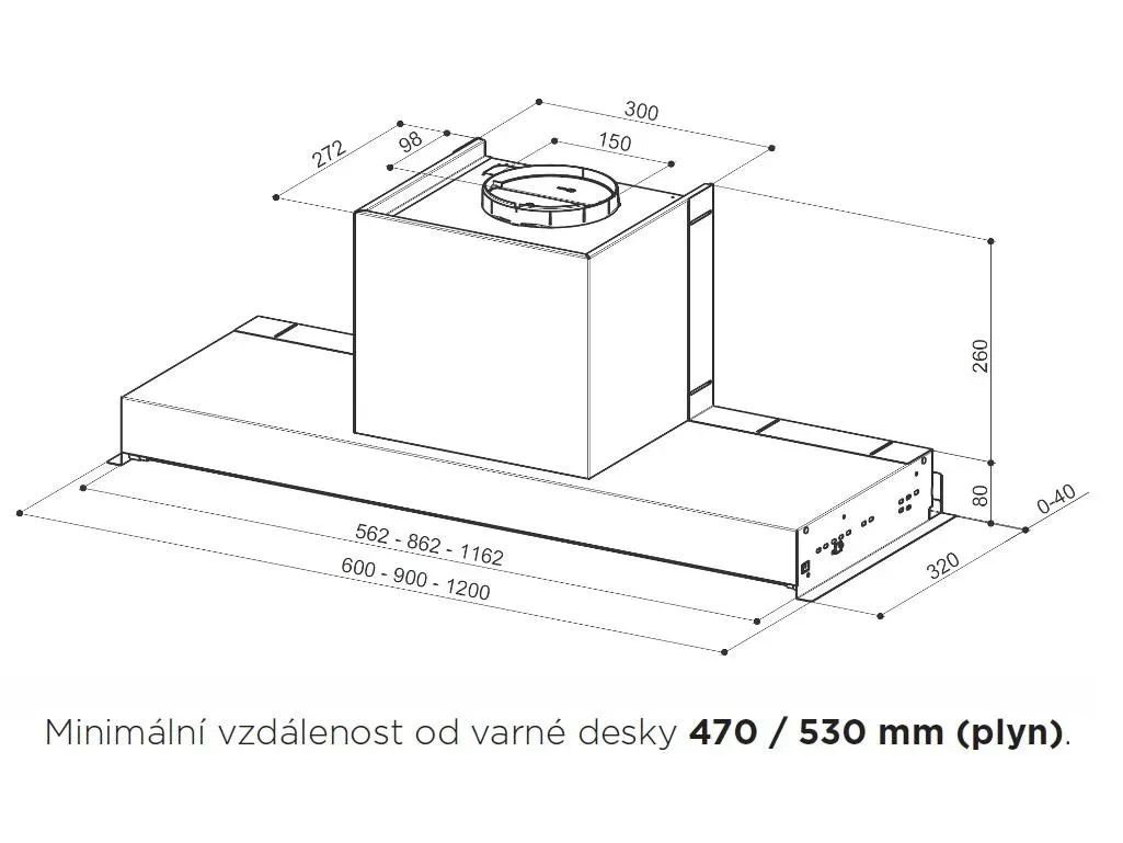 Vzduch je nasáván štěrbinou po obvodu krycího panelu. Koncentrovaný proud vzduchu proudí mnohem rychleji a získává vlastnost strhávat sebou i páry v širším okolí sací zóny. Štěrbinové sání oceníte zejména u plně vestavných digestoří, které svým rozměrem varnou zónu nikdy zcela nepřekryjí. Skleněné výklopné čílko spolehlivě ochrání dvířka skříňky před parami vzniklými během vaření.