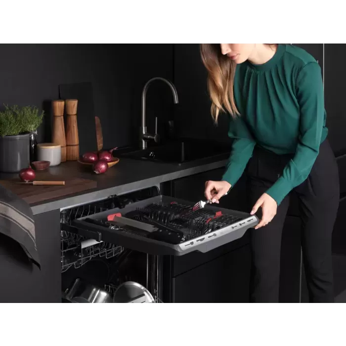 Zásuvka MaxiFlex je navržena pro příbory a náčiní rozmanitých velikostí a tvarů. Díky flexibilním dělicím příčkám a přidané hloubce si ji lehce přizpůsobíte podle potřeby. Snadno pojme a umyje většinu nádobí najednou, i když jde o náčiní jako jsou vařečky, naběračky nebo šlehací metly.