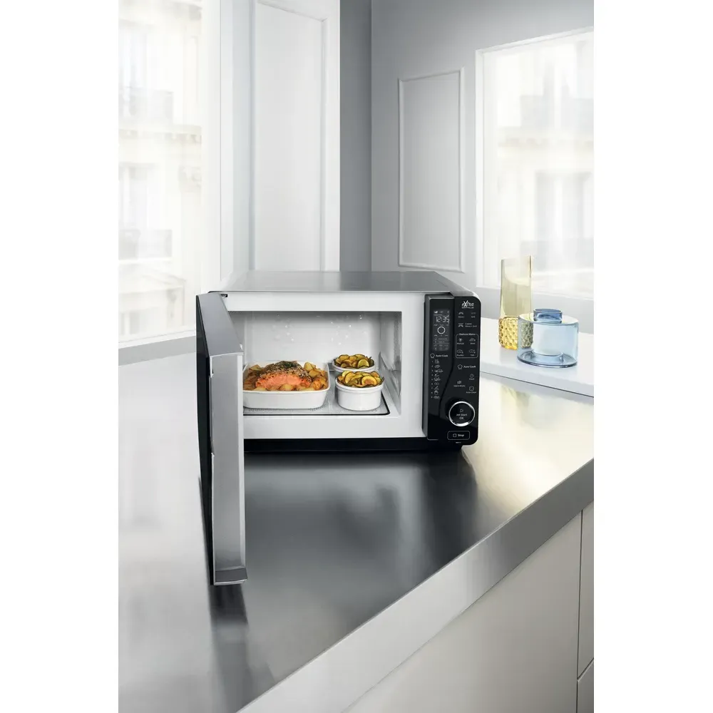 Chef Menu Široký výběr přednastavených receptů pomocí stisknutí jediného tlačítka. Zvolte si jeden z nich a mikrovlnná trouba automaticky upraví nastavení, teplotu a čas vaření, přičemž neustále sleduje vaše jídlo, aby zajistila ideální výsledky.