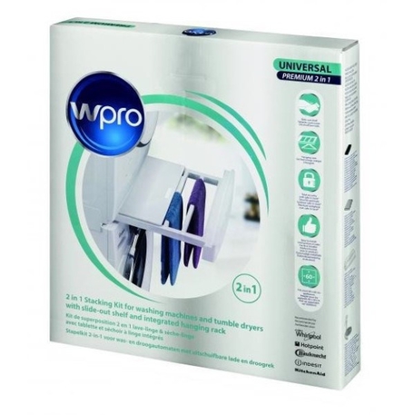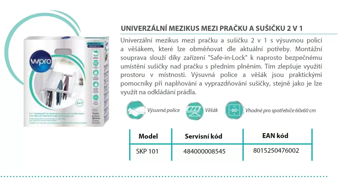 univerzální mezikus mezi pračku a sušičku 2 v 1 je opatřen výsuvnou policí s věšákem, na kterou je možné si odkládat prádlo /10kg/ během plnění nebo vyprazdňování spotřebiče, díky věšáku si můžete během praní nebo sušení například dosušit prádlo 60x60cm