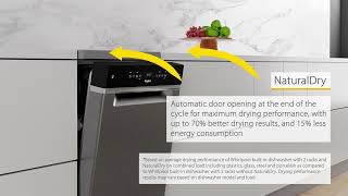 NaturalDry je systém automatického otevírání dvířek určený pro rovnoměrné sušení nádobí díky přirozenému proudění vzduchu, který vstupuje do myčky na konci cyklu. Zajišťuje vynikající výsledky a velkou úsporu energie: až o 70 % lepší výsledky a až o 15 % nižší spotřebu energie*.