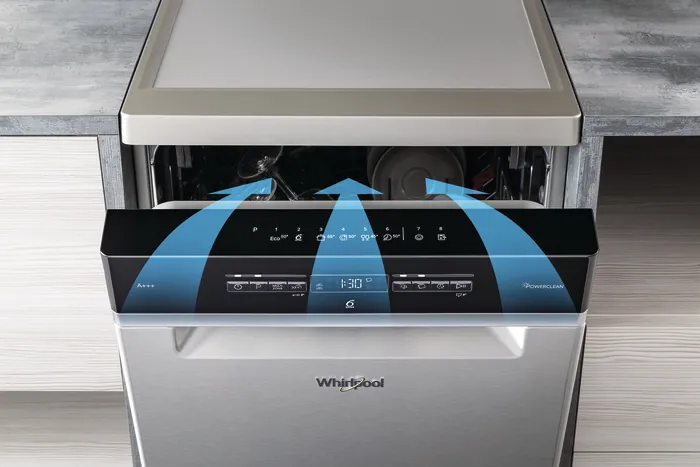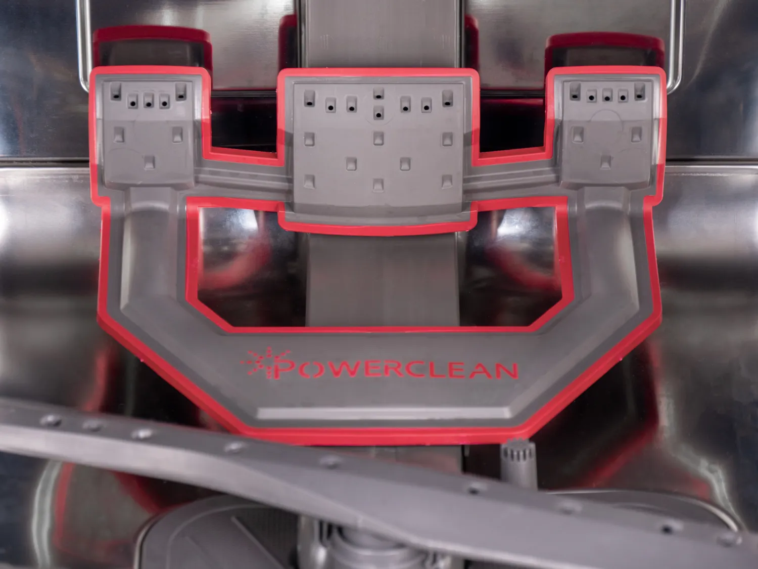 POWER CLEAN je patentovaná technologie Whirlpool pro mytí silně znečištěného nádobí ve vyhrazeném prostoru spodního koše vysokým tlakem vody, proudícího ze zadních trysek. Využitím zóny PowerClean se zvýší kapacita spodního koše o 30%.