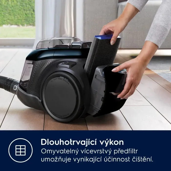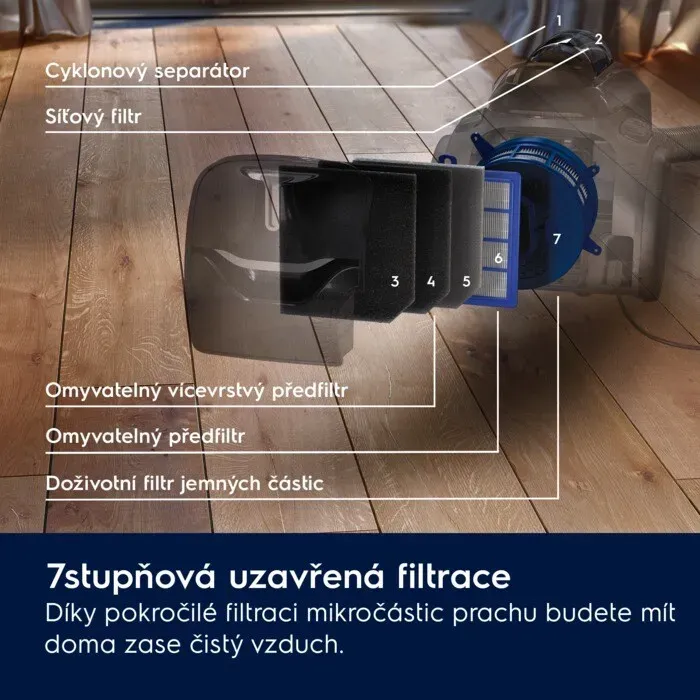 Revoluční 3D filtr je důležitou součástí 7stupňového filtračního systému a při vysávání umožňuje jedinečný výkon s minimální ztrátou sací síly.