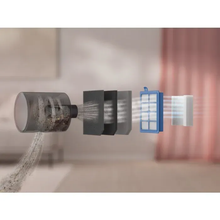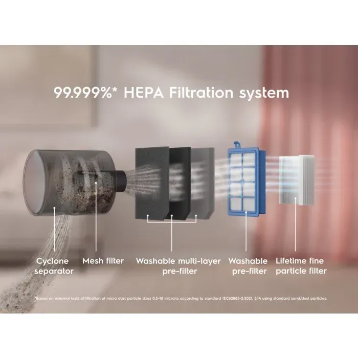 Filtrační systém HEPA je schopen odfiltrovat až 99,99 %* částic jemného prachu, roztočů a alergenů o velikosti pouhých 0,3 mikronu, a zajistit tak čistší vzduch v domácnosti.