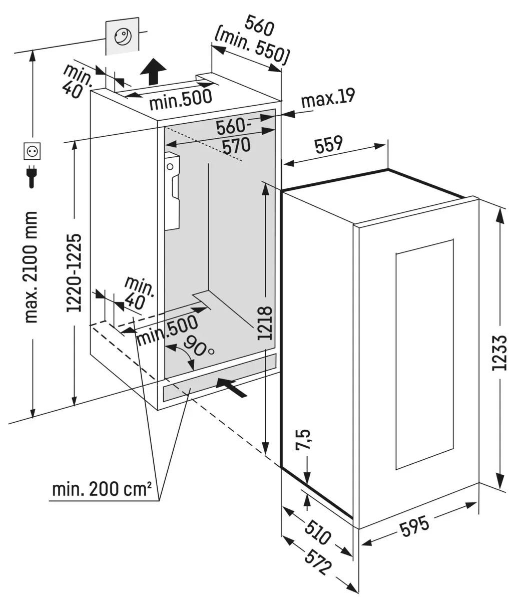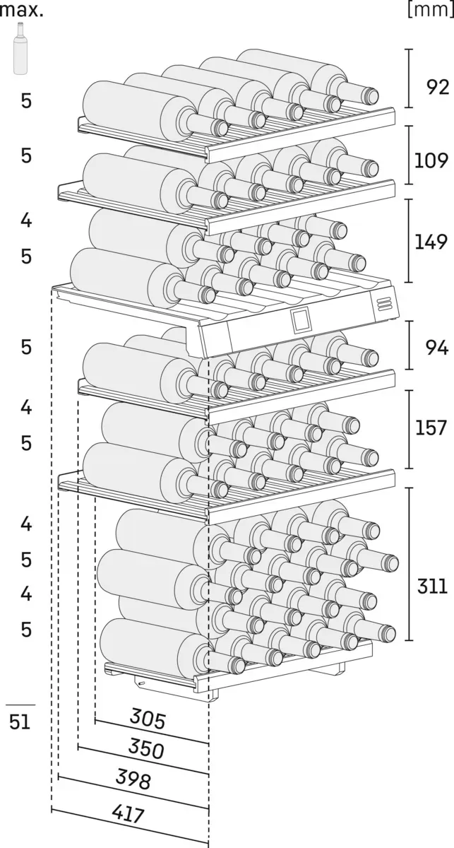 Upozornění: Uvedené množství se vztahuje na standardní láhev na víno o objemu 0,75 litru. V případě uložení lahví jiné velikosti nebo jiného tvaru se počet může lišit. Více informací k tomu naleznete na výkrese v sekci souborů pro stažení.