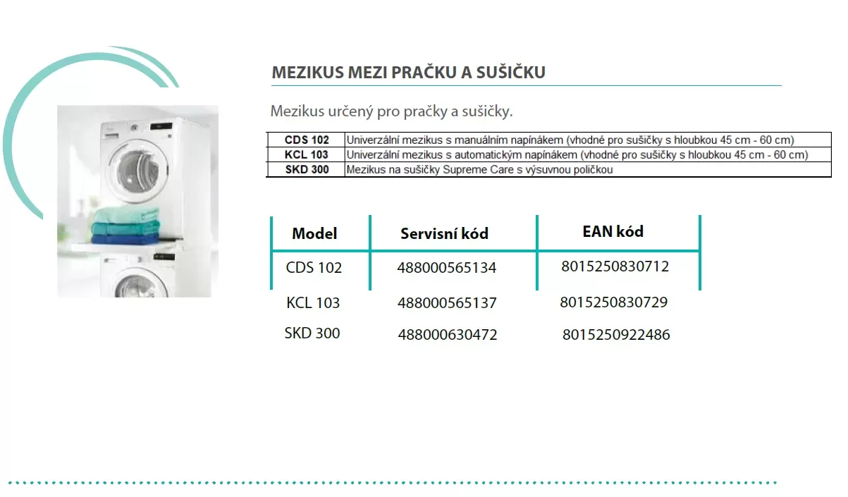 Univerzální mezikus mezi pračku a sušičku značky Wpro CDS 102. Montážní souprava slouží díky zařízení "Safe-in-Lock" k naprosto bezpečnému umístění sušičky nad pračku s předním plněním. Tím zlepšuje využití prostoru v místnosti.