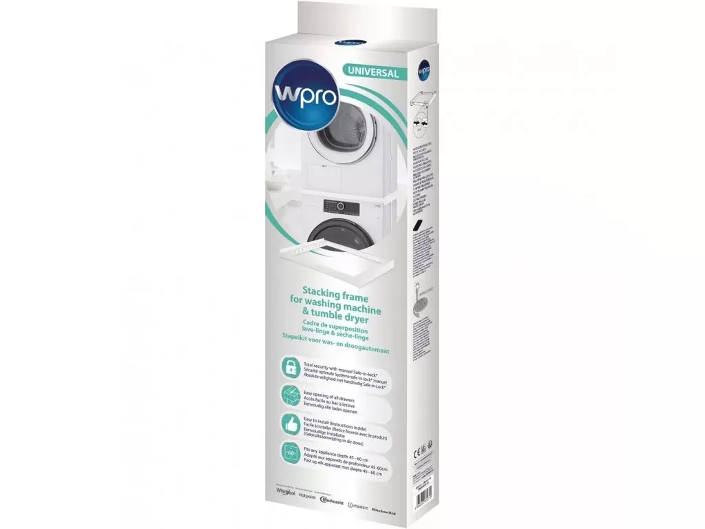 Univerzální mezikus mezi pračku a sušičku značky Wpro CDS 102. Montážní souprava slouží díky zařízení "Safe-in-Lock" k naprosto bezpečnému umístění sušičky nad pračku s předním plněním. Tím zlepšuje využití prostoru v místnosti.