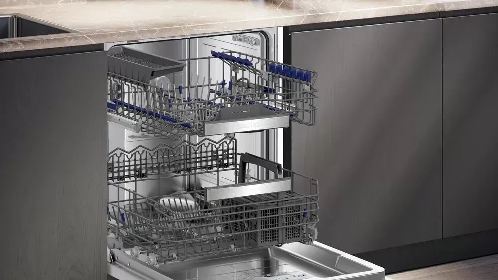 Prémiová konstrukce myček nádobí Siemens není viditelná pouze zvenčí. Modře označené uchopovací části uvnitř myčky vám na první pohled ukazují všechny možnosti nastavení košů. Velké hrnce tak mohou být uloženy rychleji. Sklenice na víno a šampaňské jsou výrazně stabilnější.