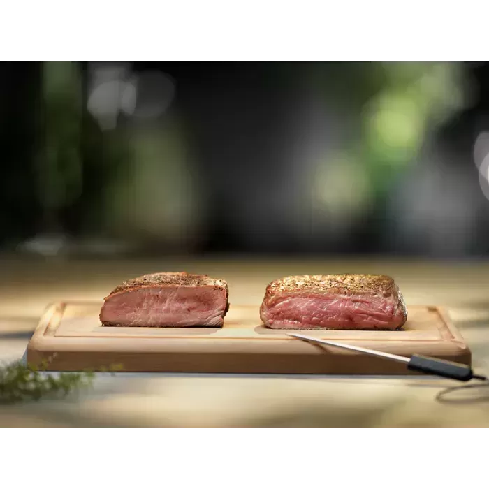 - Teplotní sonda: Teplotní sonda je podstatná pro rozhodnutí, zda je již pokrm připraven. Je přímo spojena s ovládacím panelem a pracuje jako teploměr. Zasunete sondu do středu masa nebo ryby, nastavíte teplotu a až bude pokrm upečen tak, jak si přejete, budete na to upozorněni.