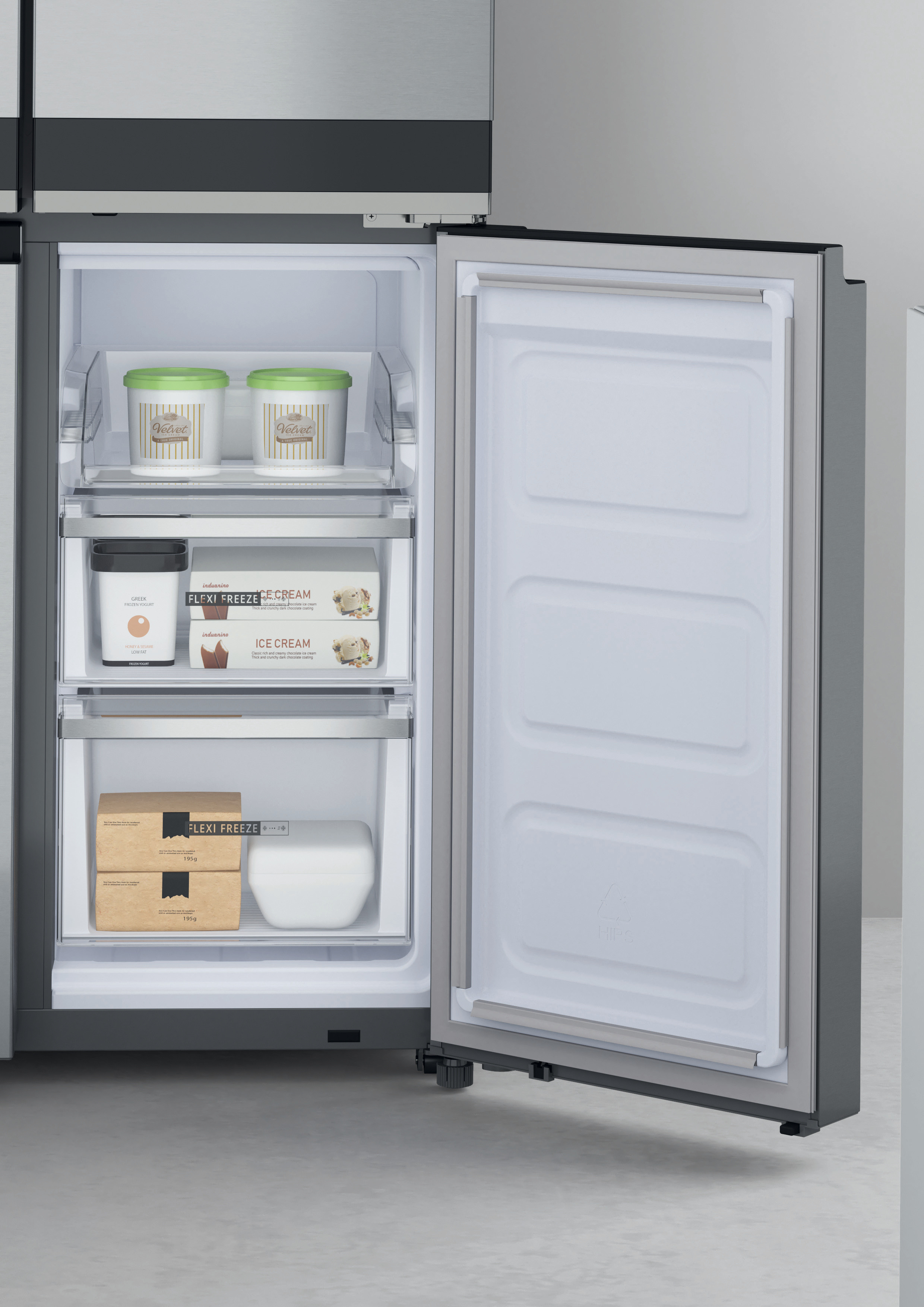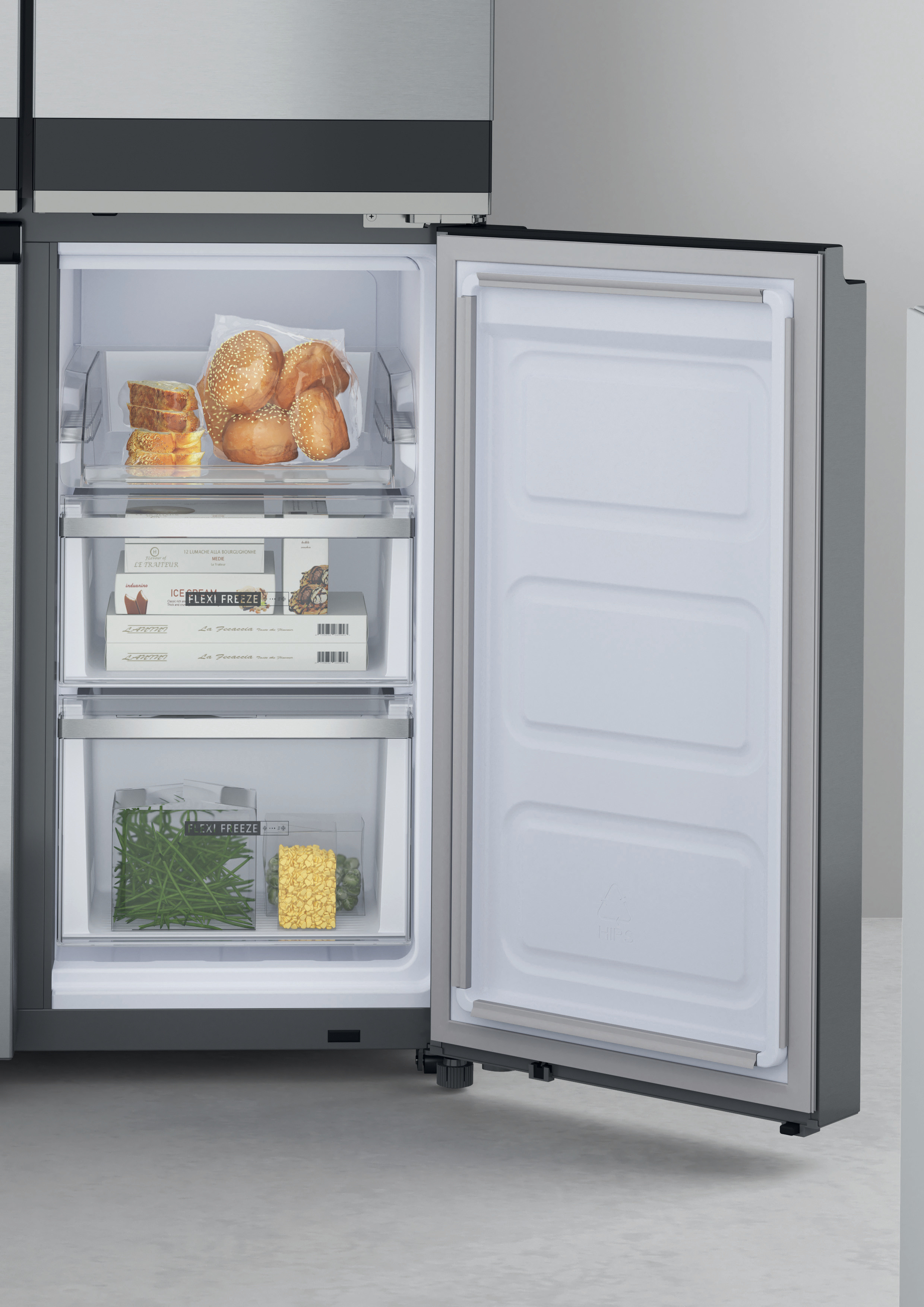 Flexi Freeze Prostorná přihrádka FlexiFreeze se přizpůsobí vašim potřebám a umožní vám zvolit správnou úroveň teploty pro to, co právě skladujete. Soft Freeze - 7 °C:vyhněte se procesu rozmrazování u zmrazených potravin, které sníte do týdne. Potraviny můžete vložit přímo z mrazničky do hrnce. Mild Freeze -12 °C: uchová zmrzlinu a dezerty vhodné k podávání. Deep Freeze -18 °C: uchová nutriční hodnotu potravin po delší dobu.