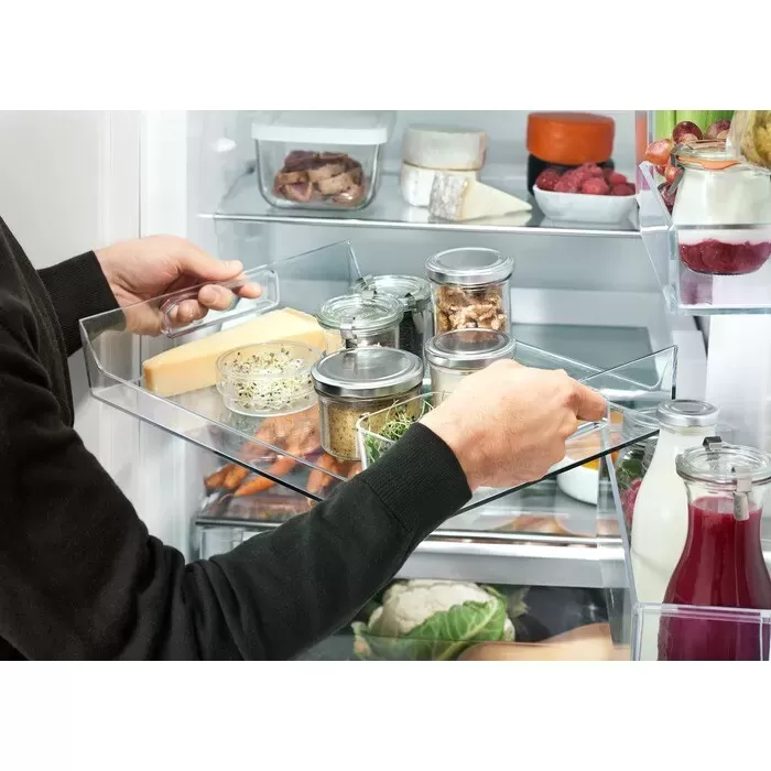 Vysunovací police s odnímatelným tácem vám nabízí snadný přístup ke všemu ve vaší chladničce. Vytáhněte polici ven, vyberte vaše přísady, odeberte tác a vezměte jej s sebou ke stolu. Pohodlné pro vaření, skvělé pro podávání. Vhodné pro vestavné chladničky.