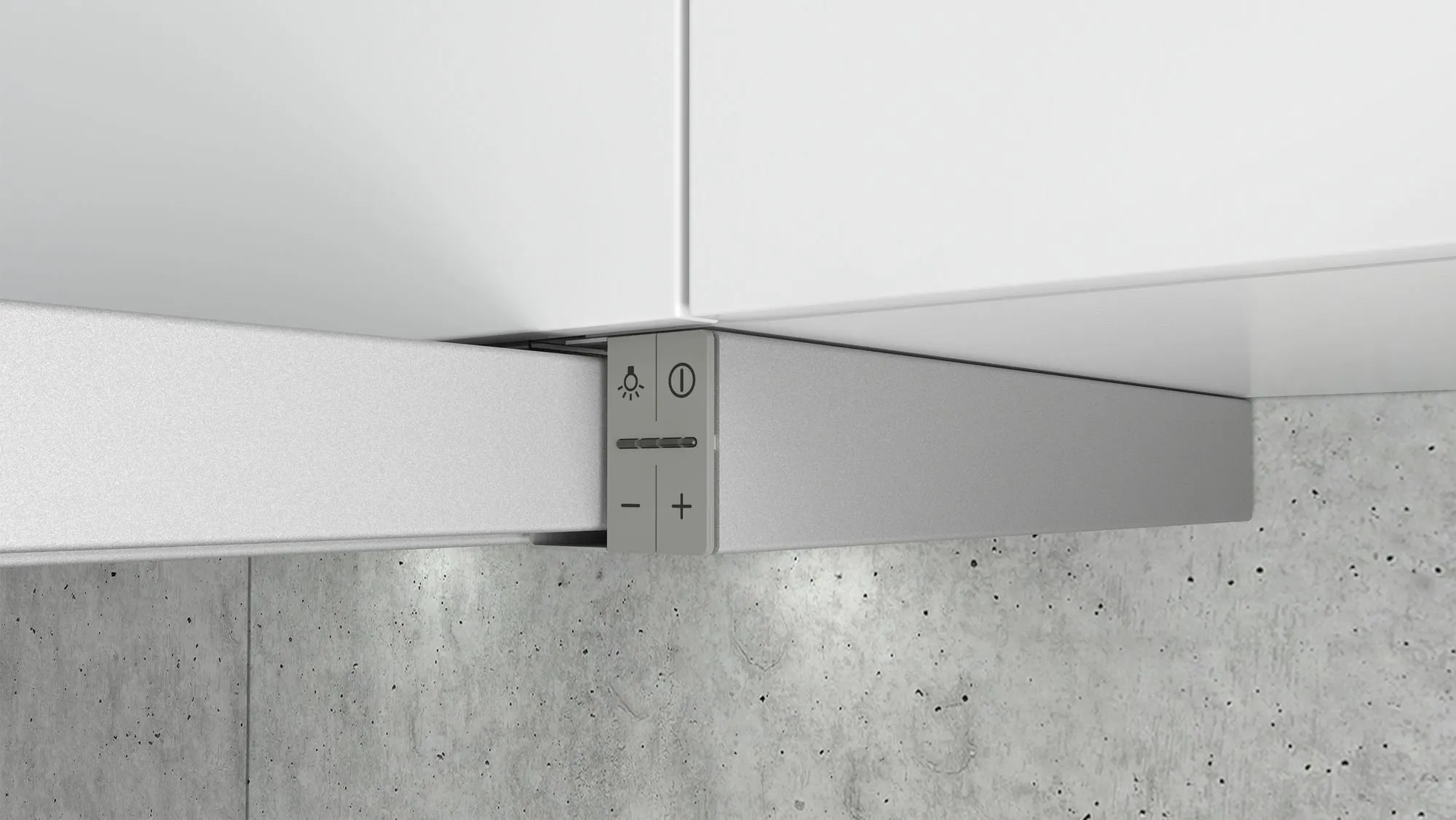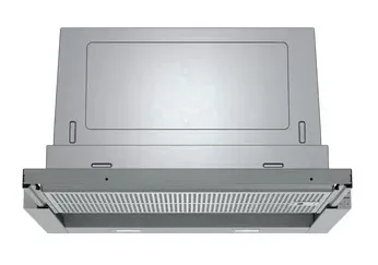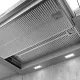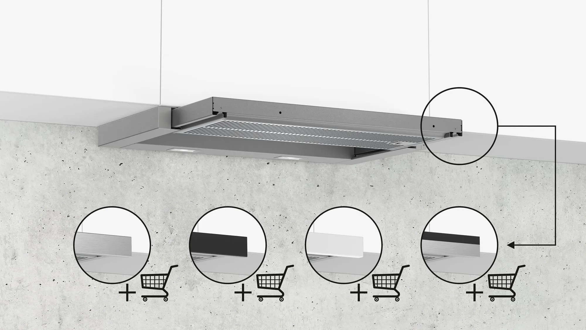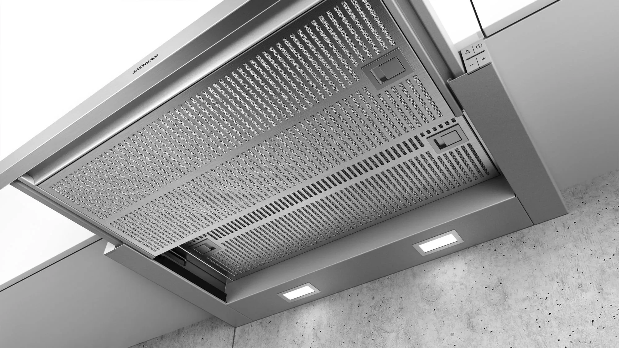 Plochý výsuvný odsavač par s vysokým výkonem a téměř neviditelným umístěním do horní skříňky.