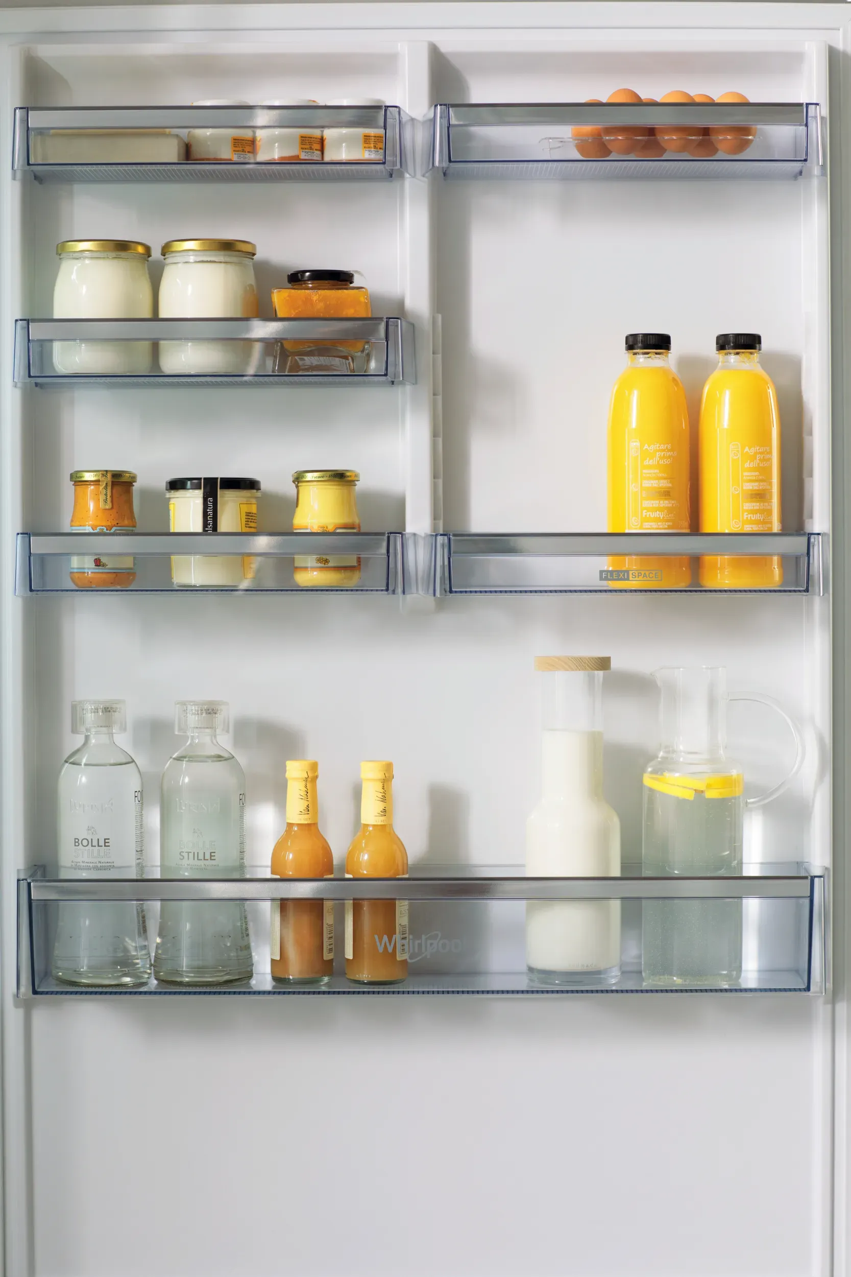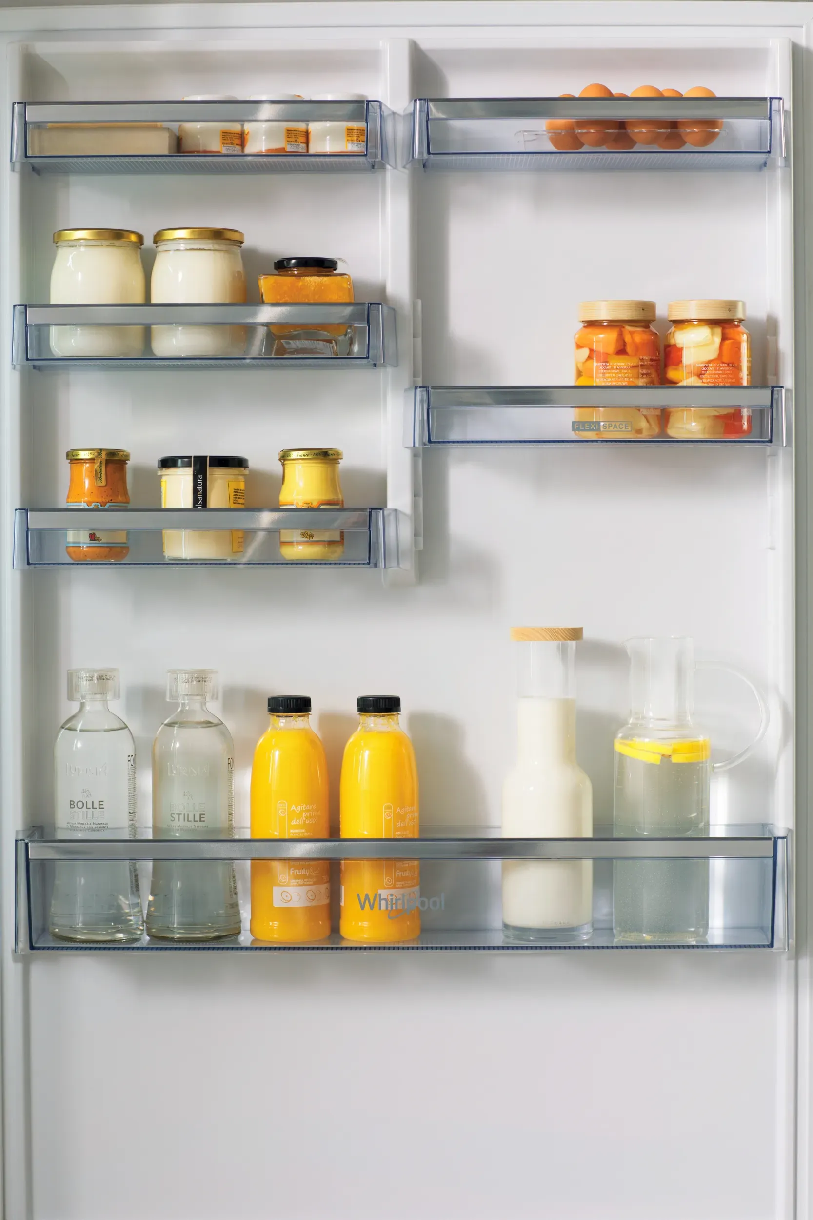 Bezpečné skladování. Tato chladnička Whirlpool poskytuje dokonalý prostor pro skladování lahví díky speciální přihrádce na lahve ve dveřích chladničky.