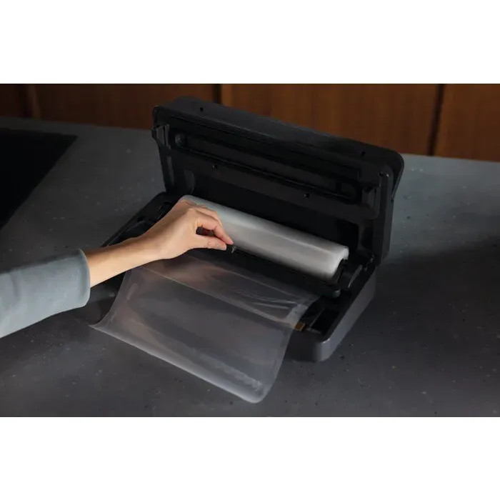 Funkce integrované rukojeti pro bezproblémové používání a snadný přístup k sáčkům. S přístrojem dostanete vše, co potřebujete: prostor pro uskladnění role a řezačka role urychlí přípravu sáčku, takže vaše potraviny budou hotové během chvilky.