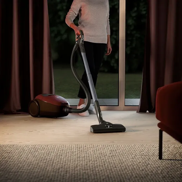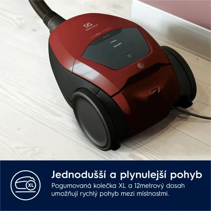 Vysavač lze pohodlně zvednout a jednoduše přenést díky speciálně navržené ergonomické rukojeti, která byla umístěna do středu tak, aby se váha vysavače rovnoměrně rozložila. Manévrování ulehčují také pogumovaná extra velká kolečka, která zároveň chrání vaše podlahy.