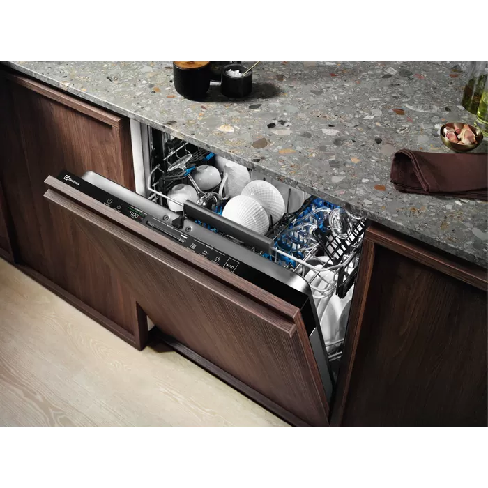- Horní košík má šetrné úchyty na 12 sklenic na víno, 2 skládací držáky, 2 skládací drátěné držáky pro skleničky, 4 měkké špičky, skládací poličky na šálky, nerezové držadlo Electrolux, Postranní držáky košíku