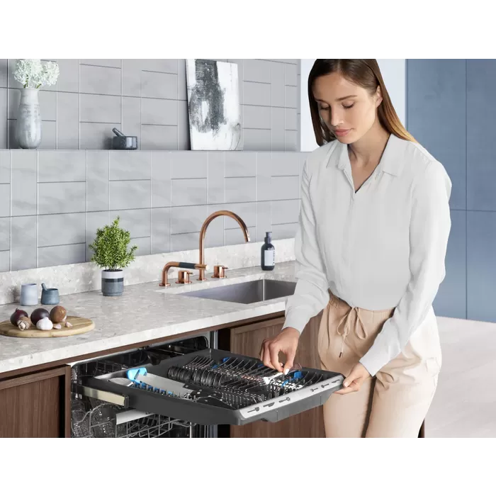 Vkládejte nebo odebírejte nádobí pohodlně s košem QuickLift. I když je horní koš plně naložený, systém QuickLift umožňuje rychlé zvednutí nebo spuštění koše, aby se do něj vešlo nádobí a kuchyňské náčiní různých tvarů a velikostí.