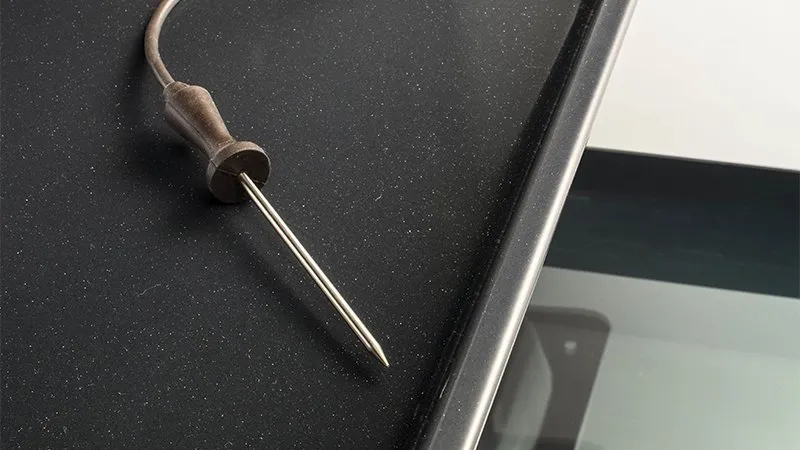 Kabelová sonda na maso umožňuje měřit vnitřní teplotu jídla a nastavit správný cyklus vaření pro dokonalý výsledek. Je zvláště vhodná pro ryby a maso.