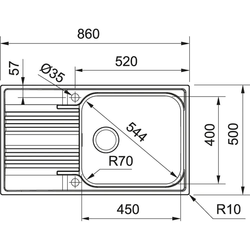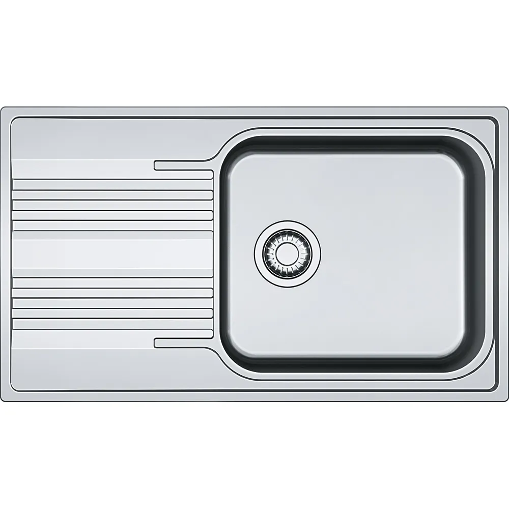Nerezový dřez Smart. Cena zahrnuje: Sítkový ventil 3 1/2“ s přepadem. Sifon pro úsporu místa 6/4“ s odbočkou na myčku nádobí.