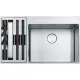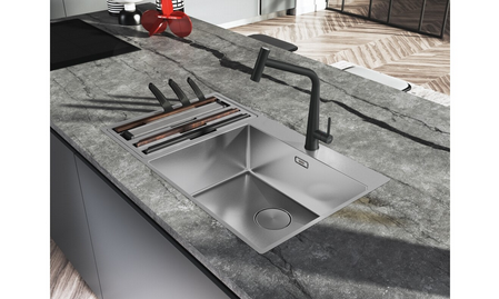 Nerezový dřez Box Center. Snadno kombinovatelné, skvěle organizované. Box Center je chytré a vysoce praktické řešení s krásným a přesvědčivým designem. Dva skvěle sloučené dřezy nabízejí prostor pro skladování a sušení často používaných kuchyňských doplňků, které jsou uloženy přímo tam, kde je nejvíce potřebujete. Cena zahrnuje: Doplňky: Miska, dřevěná přípravná deska, plastová přípravná deska, 3 nože vč. dřevěného držáku, odkapávač na nádobí, víko. Easy Click sítkový ventil 3 1/2" s přepadem a nerezovou krytkou ventilu. Sítkový ventil 3 1/2" s přepadem. Sifon pro úsporu místa 6/4" s odbočkou na myčku nádobí. Otvor pro baterii ∅ 35 mm a pro Easy Click knoflík ∅ 35 mm.