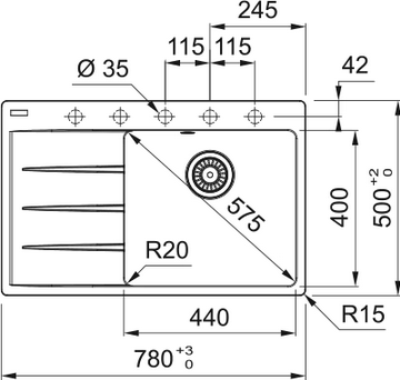 Fragranitový dřez Centro. Cena zahrnuje: Vymezovací podložku pro montáž kuchyňské baterie. Sítkový ventil 3 1/2“ s přepadem. Sifon pro úsporu místa 6/4 “ s odbočkou na myčku nádobí. 5 Míst pro vyvrtání otvoru. Možnost umístit dávkovač saponátu. Příchytky Fast- Fix. Moderní linie, jemně zaoblené hrany, k okraji mizející drážky, tenký profil. Svěží a atraktivní design.