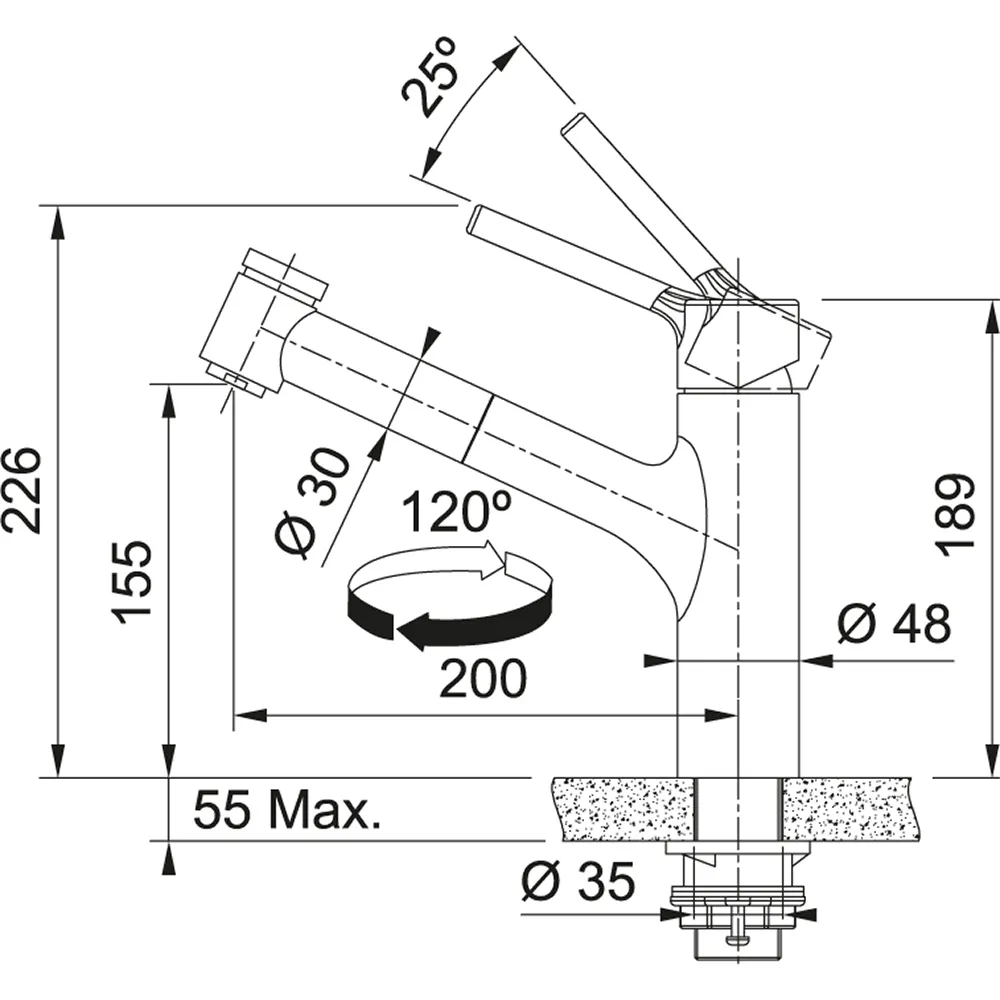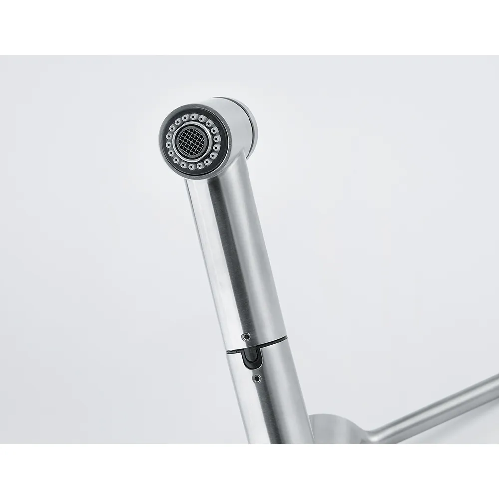 Otočná 120°. S vytahovací koncovkou osazenou perlátorem. S regulací Sprcha/Proud. Opletená sprchová hadice 150 cm. Připojení Hadičky 45 cm. Průtok vody 8 l/min. (3 bar). Laminární průtok vody. Technologie pro úsporu vody.