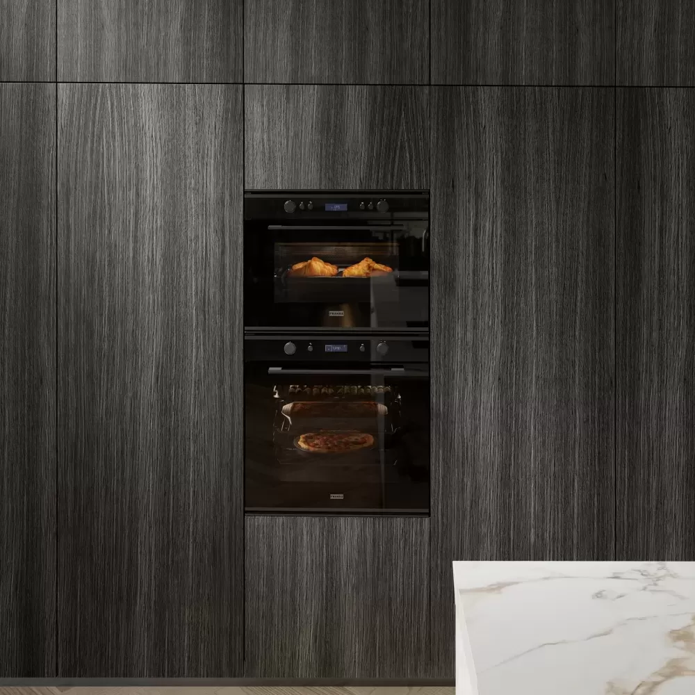 Vestavná kompaktní multifunkční trouba s mikrovlnami z řady Mythos. Kombinace černého skla a nerezi, nerezový interiér. Kapacita 40 litrů. Nabízí 25 (8 Manuálních funkcí, 10 Cook Assist funkcí, 7 Speciálních funkcí). LCD bílý displej + 2 Ovládací zamačkávací knoflíky. Smooth 2 Close dvířka. Součástí je napařovací nádoba. Výkon mikrovlnného ohřevu 900 W. Příkon grilu 1 600 W.