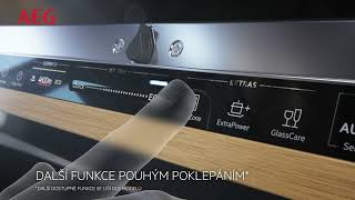 • Vlastnosti horního koše: šetrné úchyty na 12 sklenic na víno, 2 skládací držáky, 2 skládací drátěné držáky pro skleničky, 4 měkké špičky, skládací poličky na šálky, nerezové držadlo AEG, boční úchyty koše
