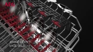 • Horní košík má šetrné úchyty na 12 sklenic na víno, 2 skládací držáky, 2 skládací drátěné držáky pro skleničky, 4 měkké špičky, skládací poličky na šálky, nerezové držadlo AEG, boční úchyty koše