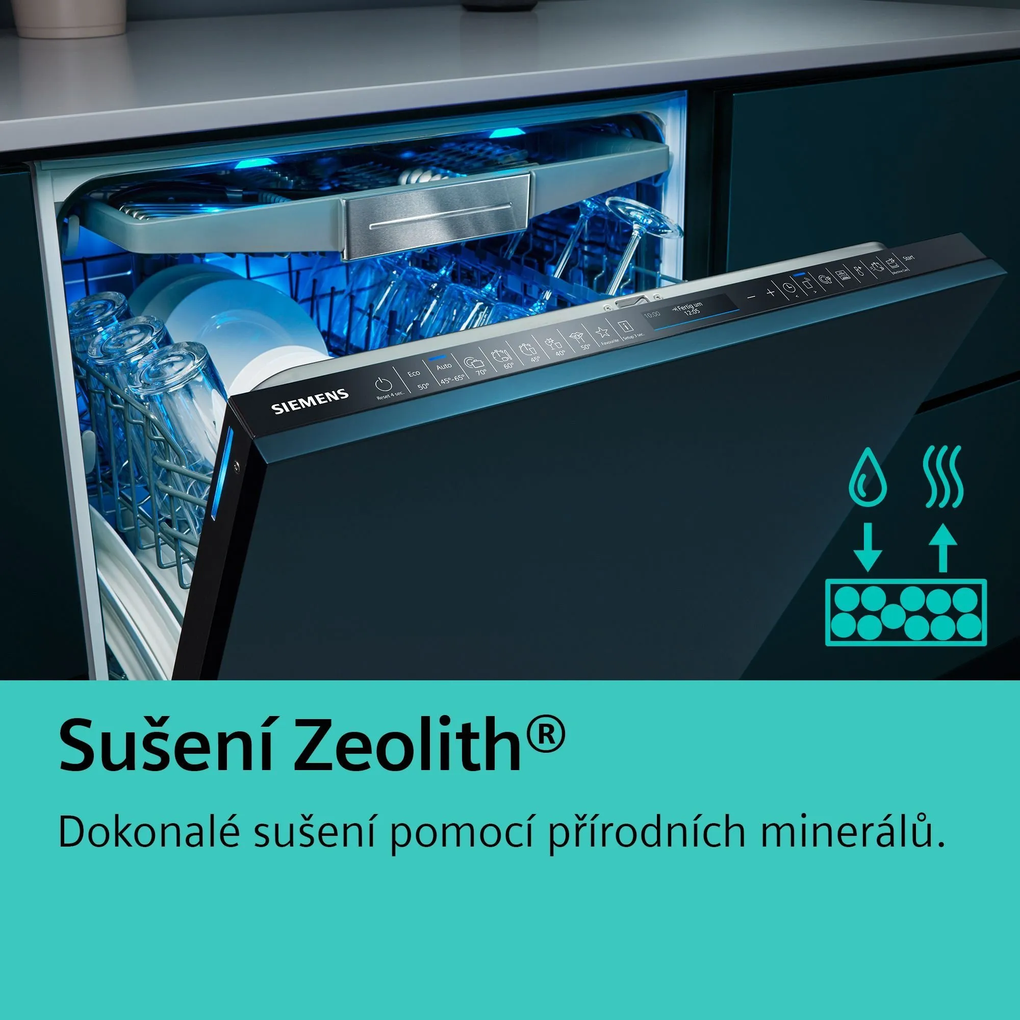 Vynikající myčka nádobí Zeolith® se speciálním prostorem pro ošetření delikátního skla.