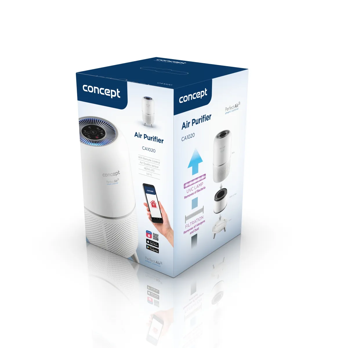Čistička vzduchu Smart Concept CA1020 pomůže odstranit škodliviny, které v domácnostech vznikají nebo tam pronikají z venkovního prostředí. Disponuje výkonem 150 m³/h a 4 rychlostmi čištění vzduchu včetně automatického režimu, který si uzpůsobí výkon podle míry znečištění. Je tichá, snadno přenositelná a vhodná do místností o velikosti až 20 m².