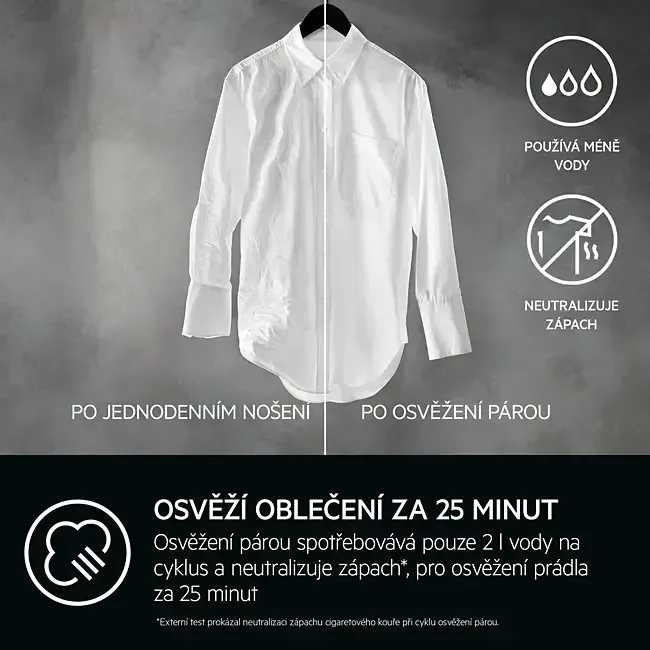 Steam Refresh neutralizuje pachy* a redukuje pomačkání oděvů za pouhých 25 minut. A pokud chcete ještě více svěžesti, přidejte naši vůni na prádlo FreshScent.