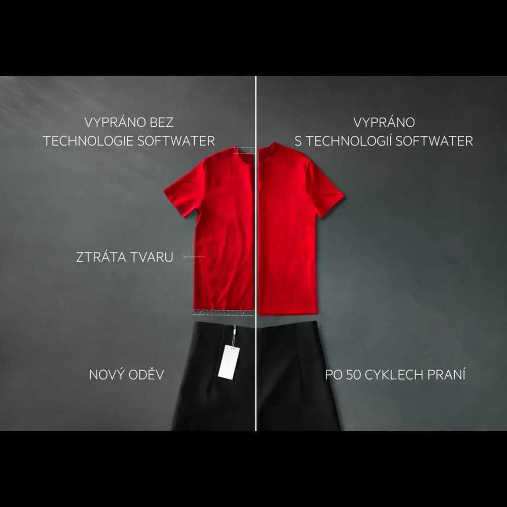 *Externí test stálobarevnosti na černém polyesteru po 50 cyklech při 30 °C technologií SoftWater. **Interní test prokázal menší srážlivost na několika bavlněných tkaninách praných technologií SoftWater v programu Bavlna vs. praní v tvrdé vodě.