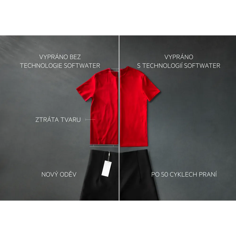 Chrání oděvy a jejich barvy. Technologie Softwater filtruje z vody minerální látky. Zamezuje tak blednutí barev i po prvních 50 praních* a zachovává tvar oblečení.** Oblečení díky tomu vydrží déle v zářivých barvách.