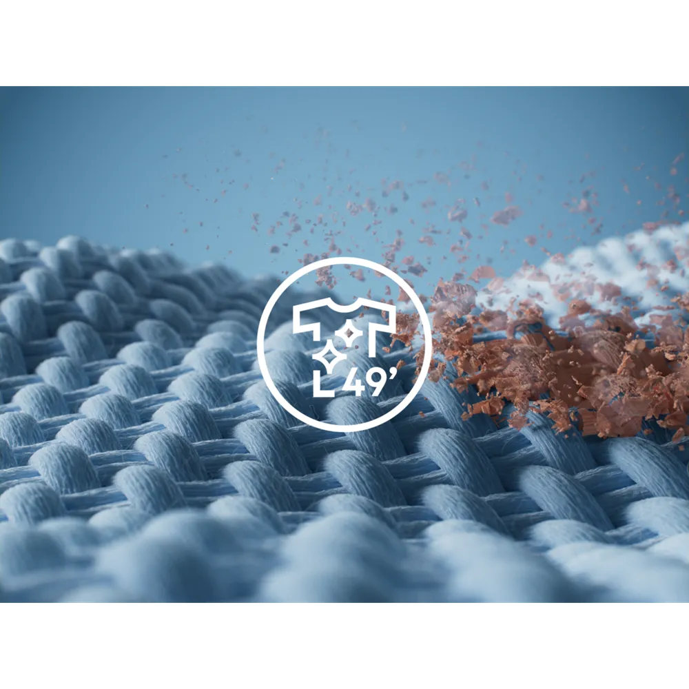 Výkonný program AbsoluteWash 49 min. důkladně vypere oblečení již při 30 °C za méně než 1 hodinu. Filtrací vody zvyšuje účinnost pracího prostředku a odstraňuje skvrny.* Při praní oděvů se spotřebuje o 30 % méně energie.